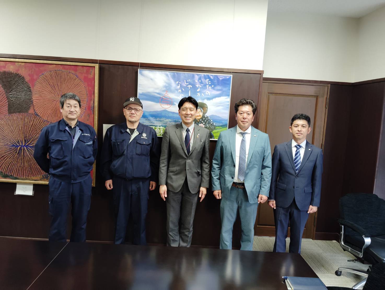 令和7年4月23日(水)に、阿蘇市、南阿蘇村並びに阿蘇広域行政事務組合を訪問し、本年2月の首長選により新たに選出された松嶋市長及び太田村長と面会のうえ、組合役員による御挨拶等を行いました。