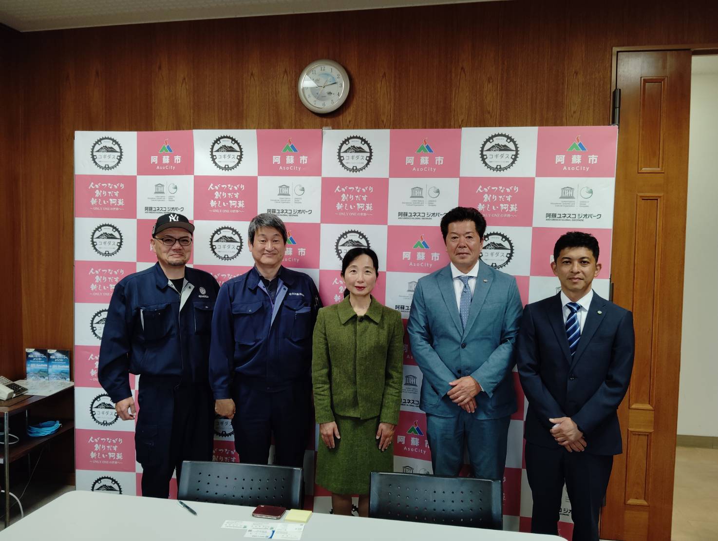 左から、㈲上村商会の上村社長、㈲大阿蘇清掃社の田中社長、松嶋和子市長、犬童理事長、